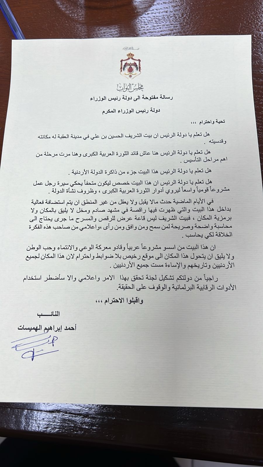وجّه النائب أحمد الهميسات رسالة مفتوحة إلى دولة رئيس الوزراء، عبّر فيها عن استهجان شديد لما جرى مؤخرًا داخل بيت الشريف الحسين بن علي في مدينة العقبة، من إقامة فعالية وُصفت بأنها مخالِفة لطبيعة المكان ورمزيته التاريخية والوطنية.