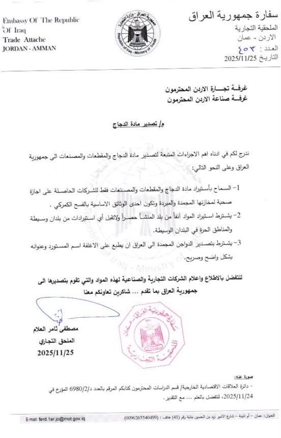 وجّهت السفارة العراقية في عمّان، عبر الملحقية التجارية، كتاباً إلى غرفتي تجارة وصناعة الأردن يتضمّن توضيحاً للإجراءات المعتمدة لتصدير الدجاج وقطع الدجاج والمصنّعات إلى العراق.