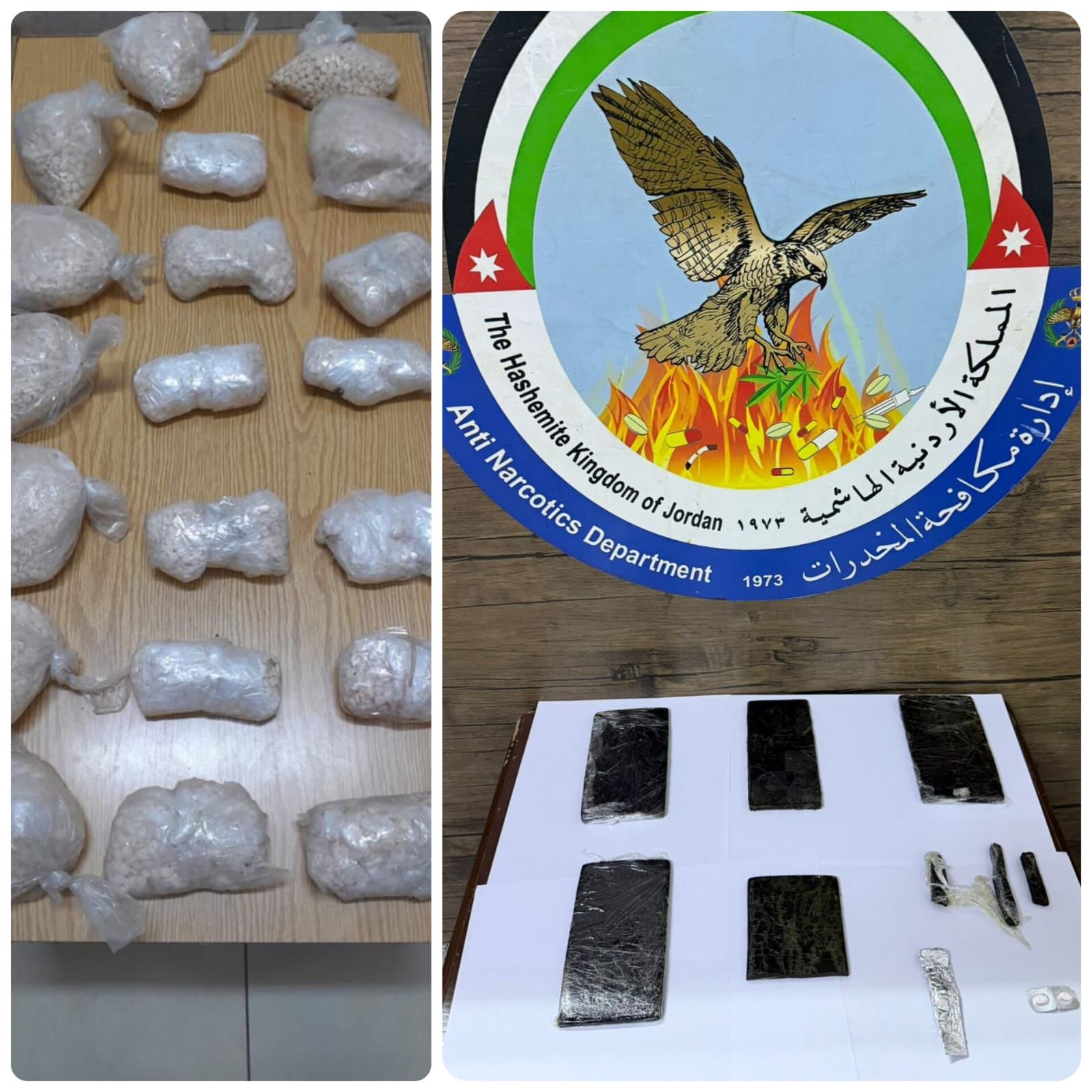 وفي محافظة المفرق وبعد مراقبة وجمع المعلومات عن أحد الأشخاص المشتبه بتورطه بالتعامل مع عصابات إقليمية لتهريب المخدرات والتأكد من نشاطاته الجرمية وحيازته للمواد المخدرة واستخدامه مزرعة في محافظة المفرق لتخزين وبيع تلك المواد، فقد جرت مداهمته وإلقاء القبض عليه وضُبط بحوزته 3 كيلو غرام من مادّة الكريستال المخدرة و 90 كف حشيش و 3000 آلاف حبّة مخدرة.