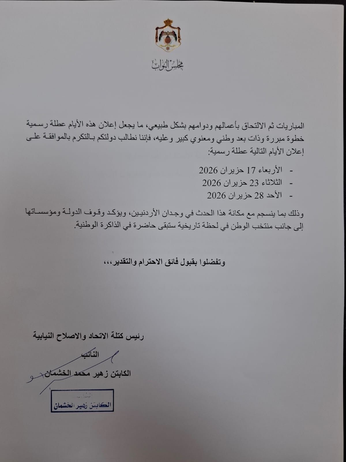 طالب رئيس كتلة الاتحاد والإصلاح النيابية النائب الكابتن زهير محمد الخشمان الحكومة بإعلان أيام مباريات المنتخب الوطني الأردني في دور المجموعات من كأس العالم 2026 عطلة رسمية، بما ينسجم مع حجم الحدث الوطني الكبير، ويمنح الأردنيين الفرصة الكاملة لمؤازرة منتخبهم في مشاركته التاريخية الأولى على هذا المستوى العالمي.