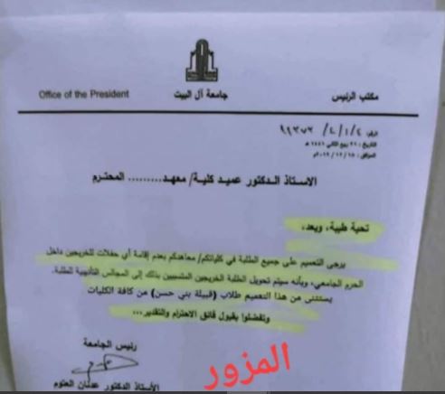 كشفت جامعة ال البيت عن كتاب مزور يتم تداوله على بعض مواقع التواصل الاجتماعي والفيس يتضمن تعميم صادر عن رئاسة جامعة ال البيت بعدم إقامة اي حفلات تخرج للطلبة خلال هذه الفتره داخل الحرم الجامعي كون الامتحانات النهائية تبدأ خلال هذه الفترة ولتوفير الأجواء المريحة والهادئة للطلبة اثناء الامتحانات صدر هذا التعميم لمصلحة الطلبة