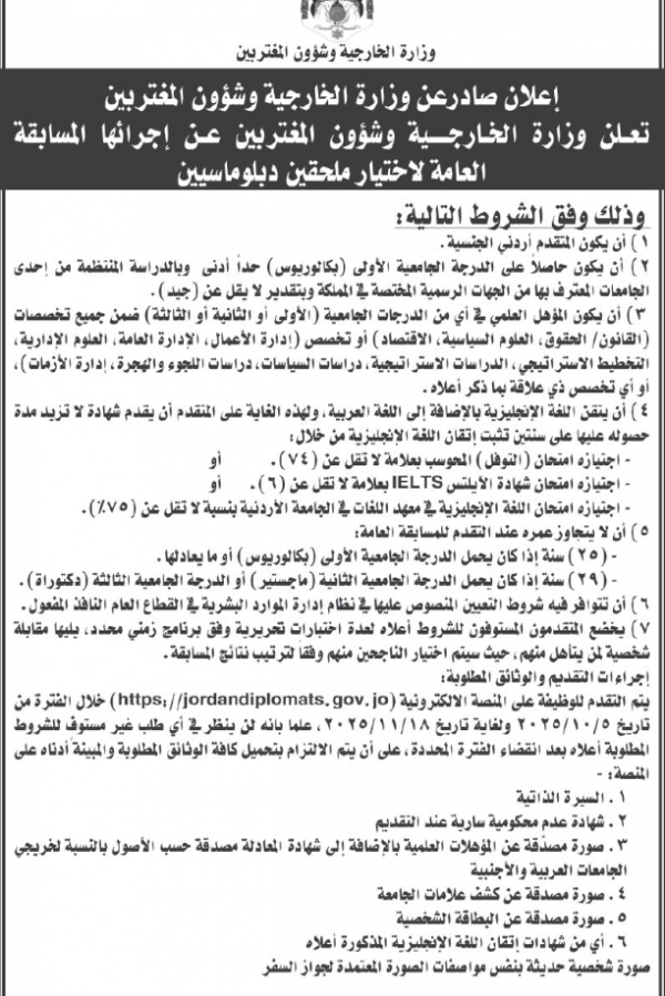 أعلنت وزارة الخارجية وشؤون المغتربين عن إجرائها المسابقة العامة لاختيار ملحقين دبلوماسيين، وفقًا لعدة شروط أبرزها أن يكون المتقدم أردنيَّ الجنسية، وأن يكون حاصلًا على الدرجة الجامعية الأولى (بكالوريوس) حدًّا أدنى والدراسة المنتظمة من إحدى الجامعات المعترف بها من الجهات الرسمية المختصة بالمملكة وبتقدير لا يقل عن (جيد).