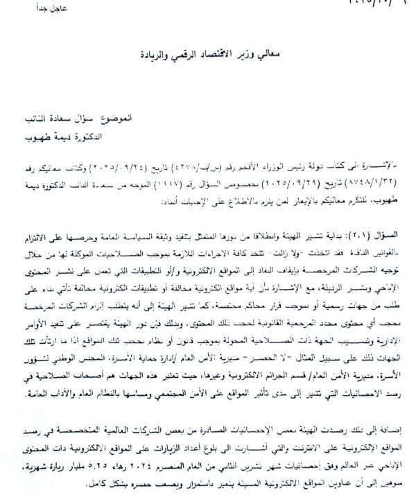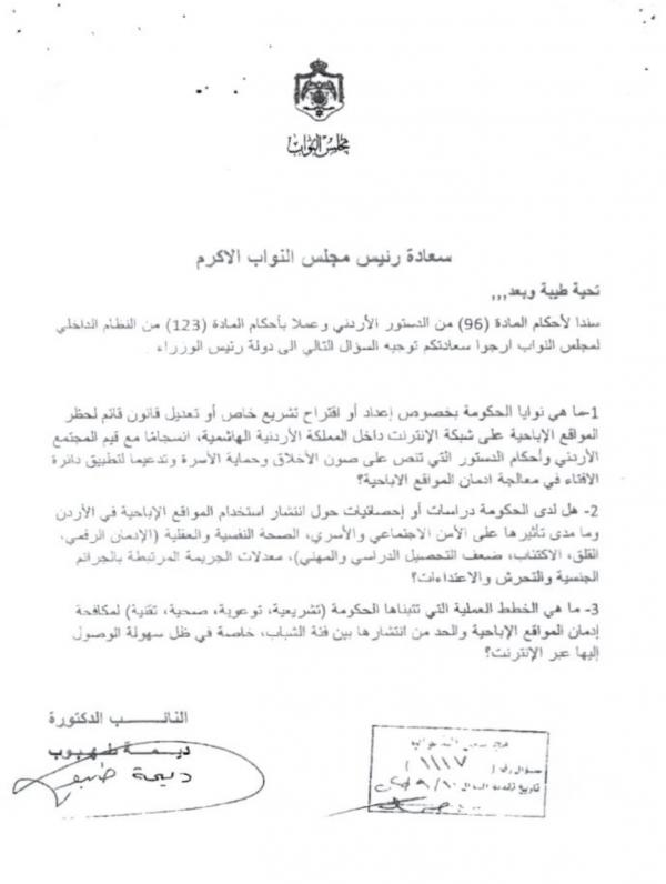 جاء ذلك بعد توجيهها سؤالا نيابيا إلى الحكومة حول إعداد تشريع خاص لحظر المواقع الإباحية، وتلقيها ردا بأن دور هيئة تنظيم قطاع الاتصالات يقتصر على اتخاذ اجراءات بتوجيه الشركات لإيقاف النفاذ الى المواقع الالكترونية التي تنشر الرذيلة.