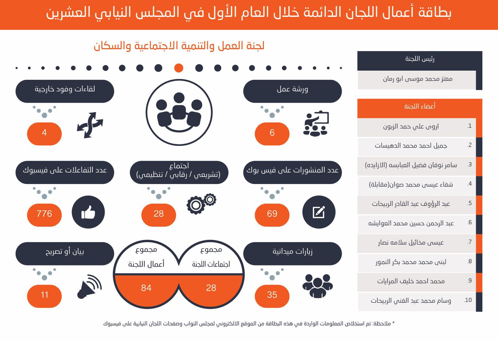 أما بما يتعلق بالمشاركة بورشات العمل فقد كانت لجنة الشباب والرياضة الأعلى بعدد المشاركات بواقع 14 مشاركة، ثم لجنة الخدمات العامة بـ 13 مشاركة، تلتهم اللجنة الإدارية بـ 8 مشاركات، ثم لجنة العمل والتنمية الاجتماعية بـ 6 مشاركات، ثم لجنة الزراعة والمياه بـ 5 مشاركات، ولجنة فلسطين بـ 4 مشاركات.