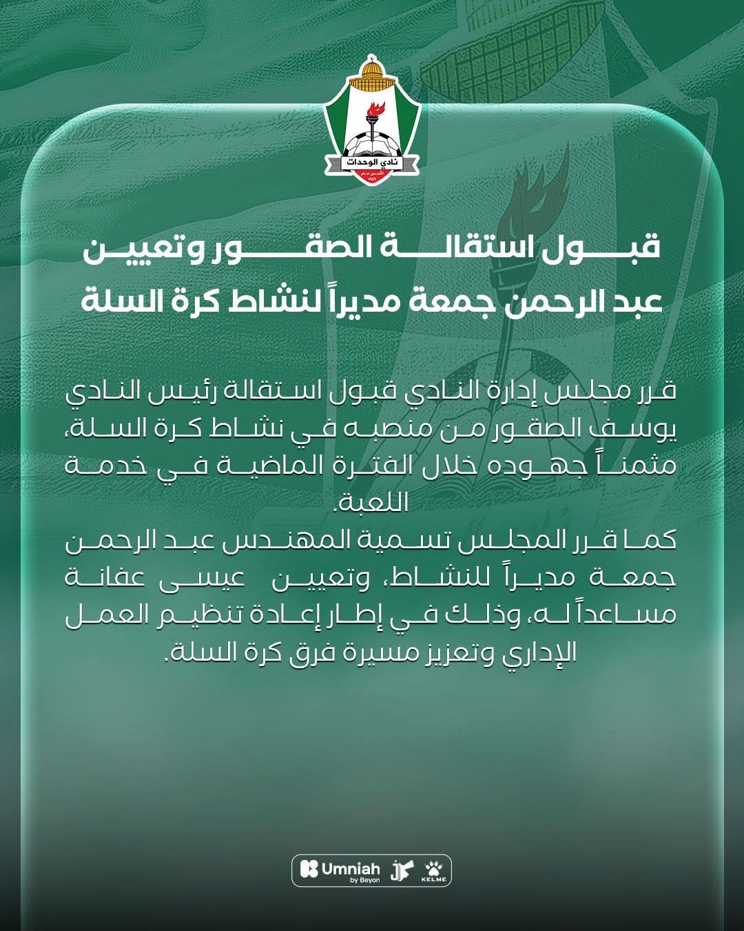 أعلن إدارة نادي الوحدات عن قبول استقالة رئيس النادي يوسف الصقور من منصبه في إدارة نشاط كرة السلة، مثمنًا جهود الصقور في تطوير اللعبة خلال الفترة الماضية.