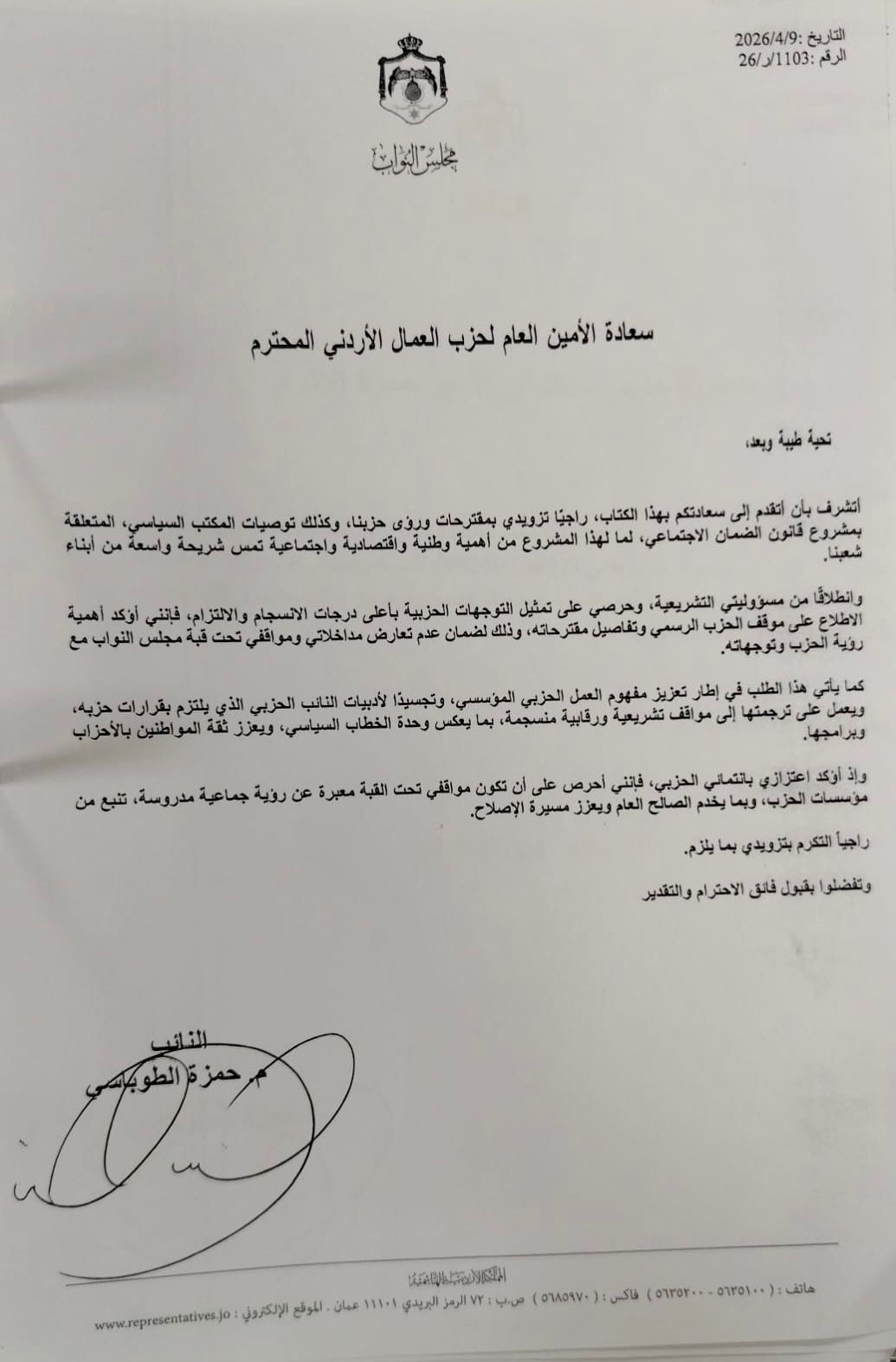 لوزان عبيدات - وجّه النائب حمزة الطوباسي خطاباً رسمياً إلى الأمين العام لحزب العمال الأردني، يطالب فيه بتزويده بالمقترحات والرؤى الخاصة بالحزب، وتوصيات المكتب السياسي المتعلقة بمشروع قانون الضمان الاجتماعي.