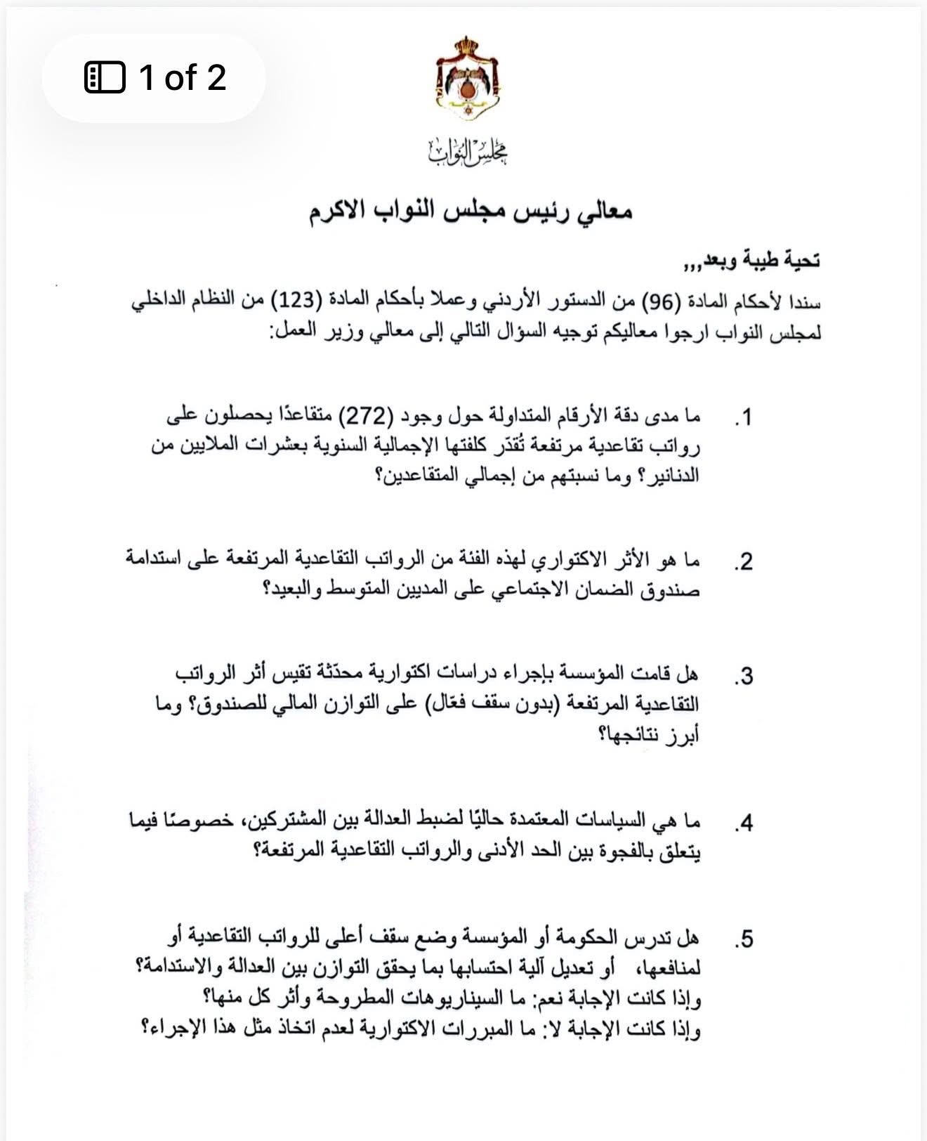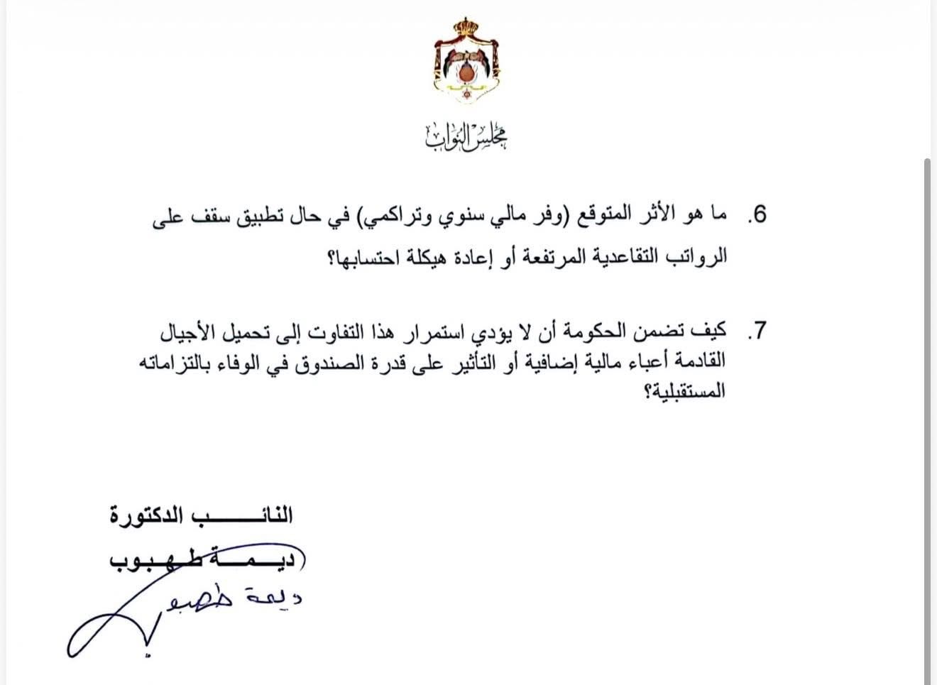 وطالبت طهبوب الحكومة بتوضيح دقة هذه الأرقام، وبيان نسبتهم من إجمالي المتقاعدين، إضافة إلى الكشف عن الأثر الاكتواري لهذه الفئة على استدامة صندوق الضمان الاجتماعي على المديين المتوسط والبعيد.
