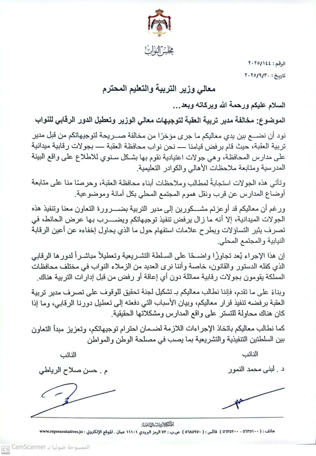 وجّه النائبان عن محافظة العقبة، الدكتورة لبنى محمد النمور والمهندس حسن صلاح الرياطي، مذكرة إلى وزير التربية والتعليم، طالبا فيها بالتحقيق مع مدير تربية العقبة بعد رفضه تنفيذ توجيهات الوزارة المتعلقة بالسماح لهما بإجراء جولات رقابية على مدارس المحافظة.